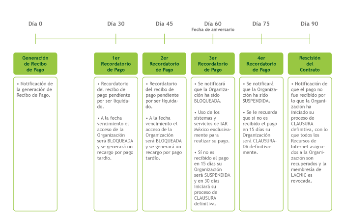 IAR México enviará las siguientes notificaciones de pago si el mismo no es recibido después de la fecha límite, es decir la Fecha de Aniversario de la organización.